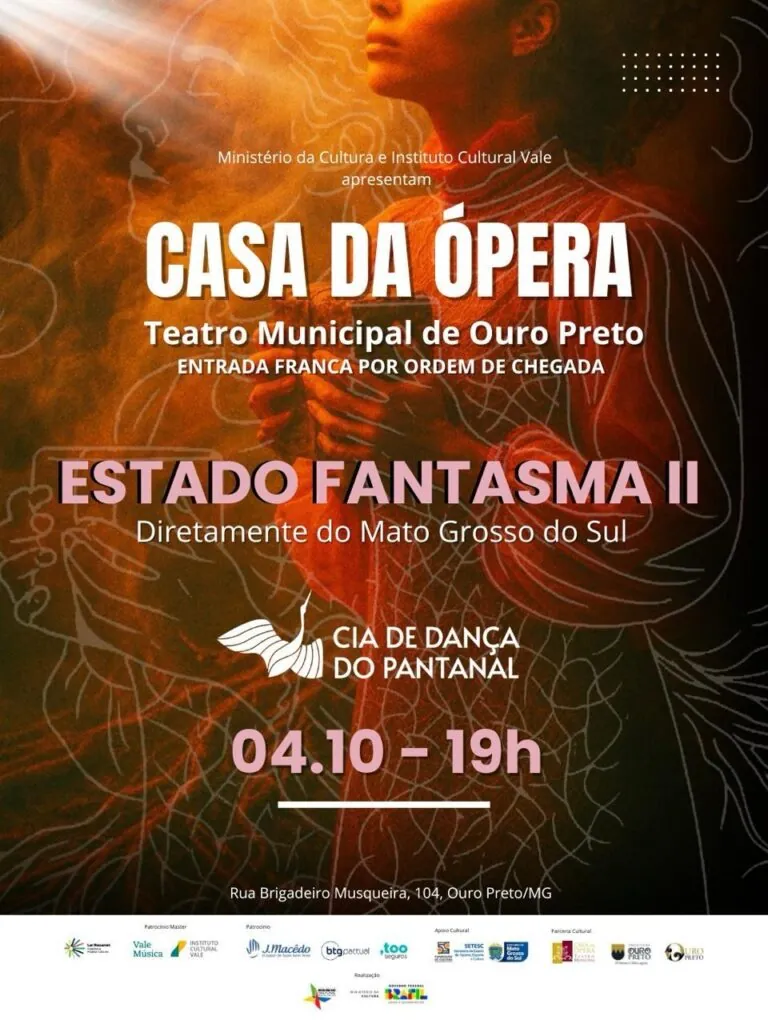 O palco histórico da Casa da Ópera – Teatro Municipal de Ouro Preto, o mais antigo em atividade das Américas, recebe no dia 4 de outubro, às 19h, o espetáculo Estado Fantasma II, da Cia de Dança do Pantanal. A apresentação, com entrada gratuita por ordem de chegada, traz ao público mineiro uma experiência coreográfica que conecta arte, natureza e espiritualidade.